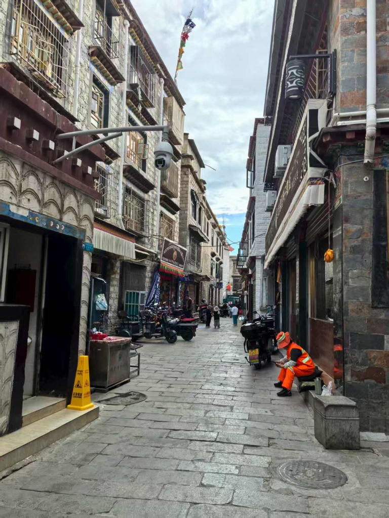 从步行街出来以后,我就在巷子里钻来钻去。周边都是居民区,一栋栋看起来像自建的三层、四层小楼,不知道里面是什么样子。楼与楼之间的巷子并不宽敞,但能看出来这些巷子就是当地居民生活的日常,有各种店铺、有保洁、还有警察的办公室。不过我困惑的是,在如此地广人稀的地方,为什么居民区要建的如此密集,完全可以宽敞点嘛,不知道这是历史形成还是规划者的某种考量。恰巧碰到学校放学,一路上的家长背着大大的书包,小朋友跟在身后,跟其他地方也并无二致。不同的是,家长中尤其爷爷奶奶,大多穿着传统的藏袍,而小朋友穿着现代的校服,这情形其实也是颇为有趣。