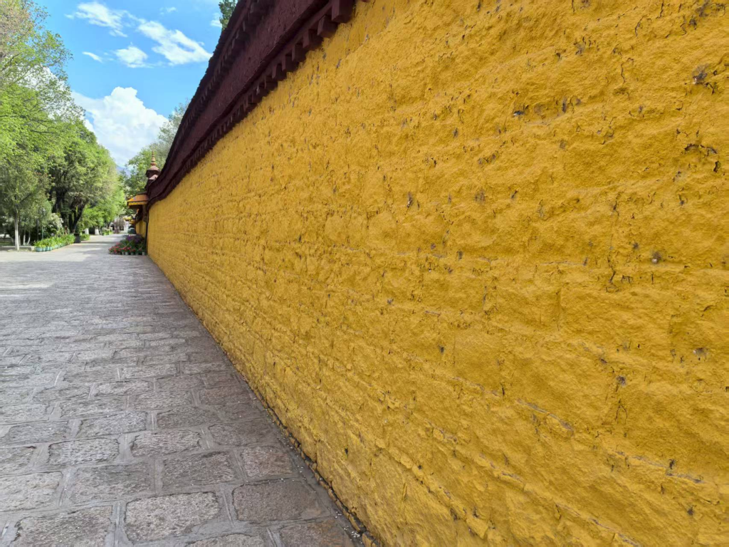 下了飞机,我一直在感受自己有没有什么变化。尝试深呼吸,感觉来感觉去,并没有什么不同,便开始得瑟,啥感觉也没有嘛。从大巴车下来以后,一看地图离酒店才几百米,便打算走过去。推着箱子,走了没到一百米,便开始有些气喘吁吁。这才体会到,攻略的提醒,得走慢一点,不能嘚瑟。拉萨的第一印象,天特别近,阳光分外明媚,街两旁的墙上白的、红色、黄色的颜色,在阳光下也显得特别明艳,路上的行人看起来有点黑黑的,街上也弥漫着一种有点刺鼻的香味。